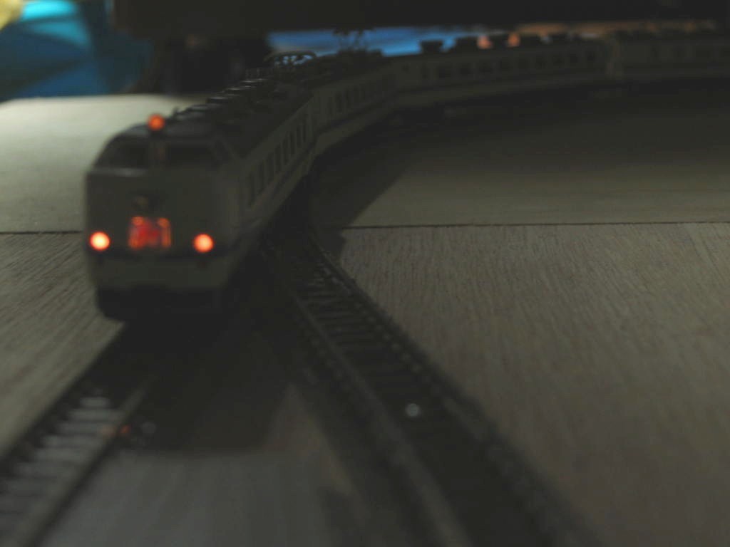 暗闇の中、田川駅(仮称)構内に入線してきた、非貫通形S雷鳥。