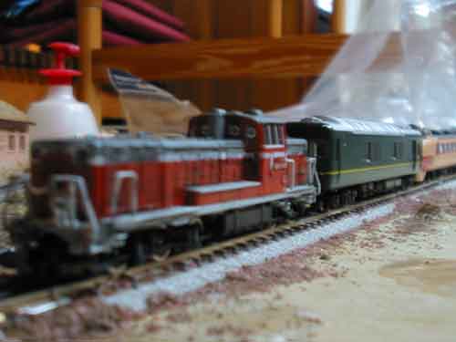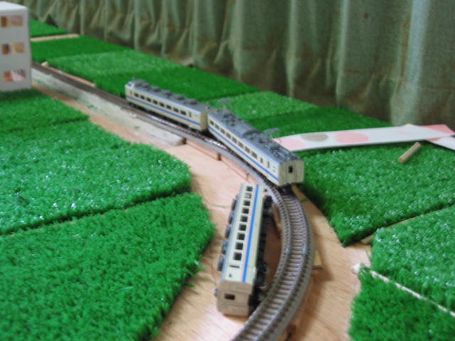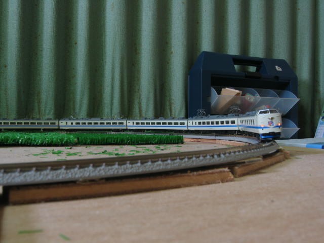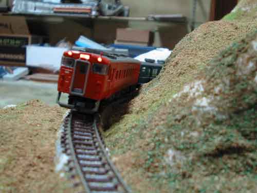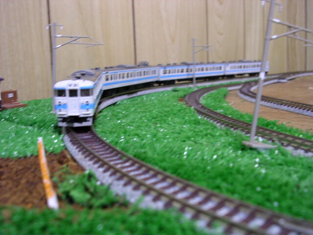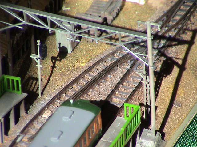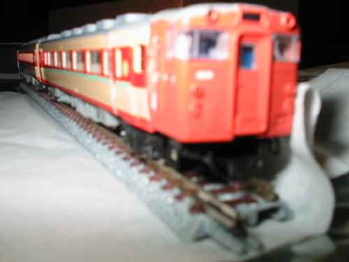 ちなみにこの写真のレールはポイント部分以外TOMIX茶色レール。 丁寧にバラスト撒いたので、ほとんどわからないっぽいですぅ。 |