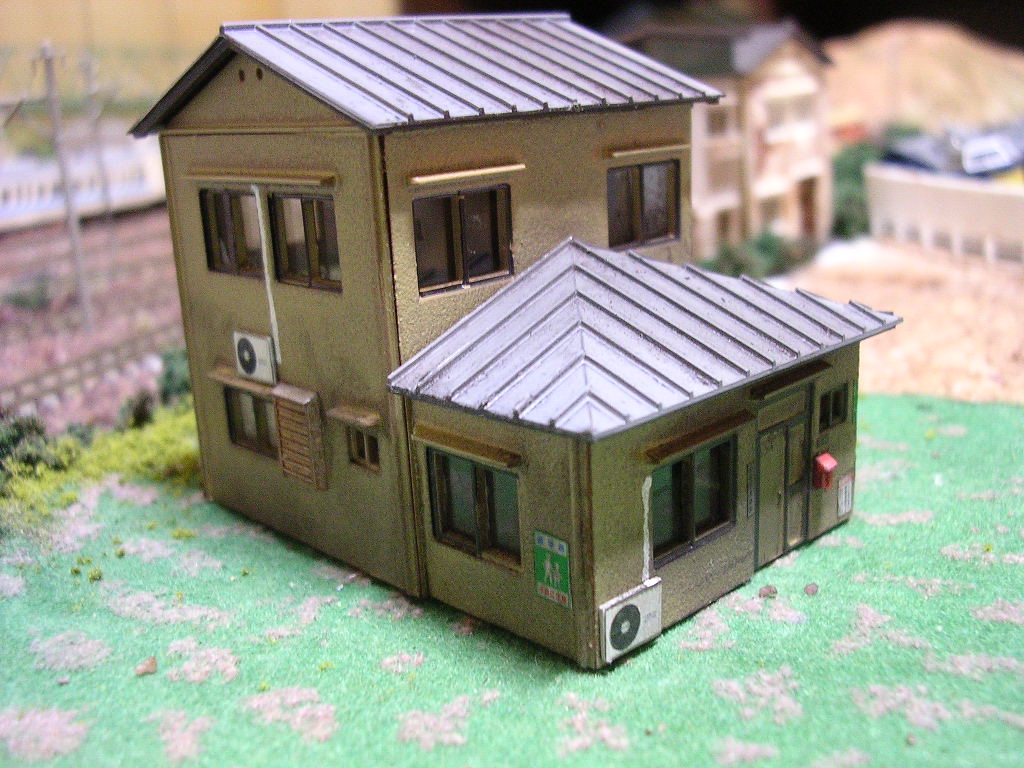 なかなか綺麗な住宅ですねぇ。。手間がかかるとくれば、遠慮ぎみ(ぉぃ で、今日完成したグリーンマックスの住宅キット改造版らしです |