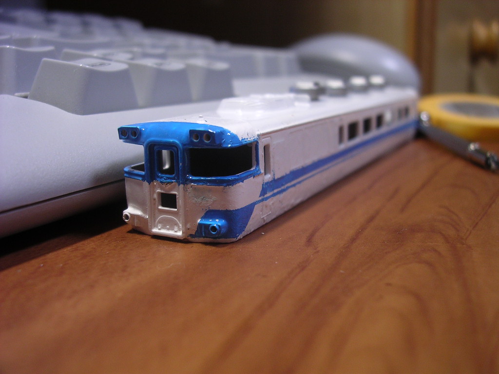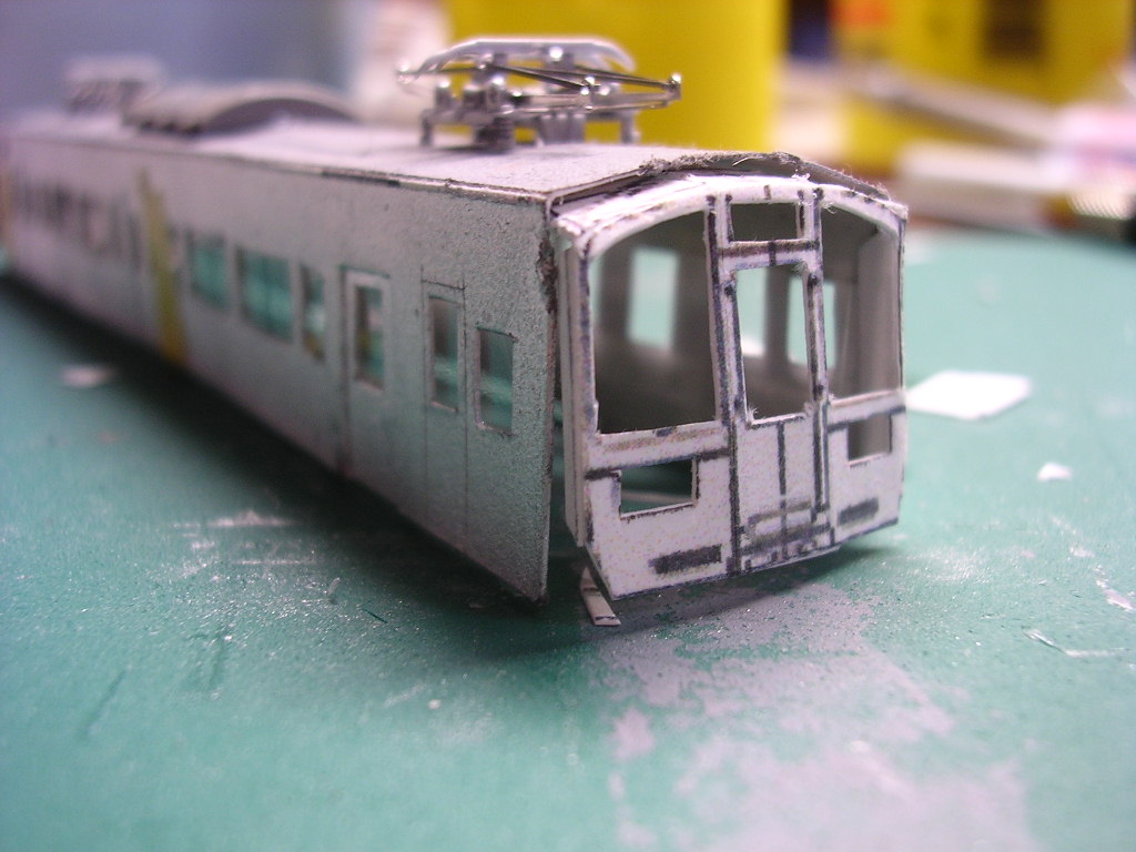 薄い紙でも塗装すれば強度は確保できますよ。晩年型だったら横揺れダンパも削っちゃえ 美観的に、帯の色が途中から変わるってことは無視。貫通扉部の色さしがんばってね。 |