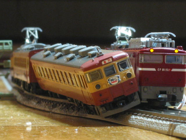 この前、ポイントがうまく切り替わらなかったために、 本線・副本線両方に通電してしまい、 合流点で衝突、475は脱線しました(W |