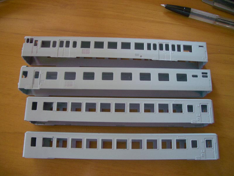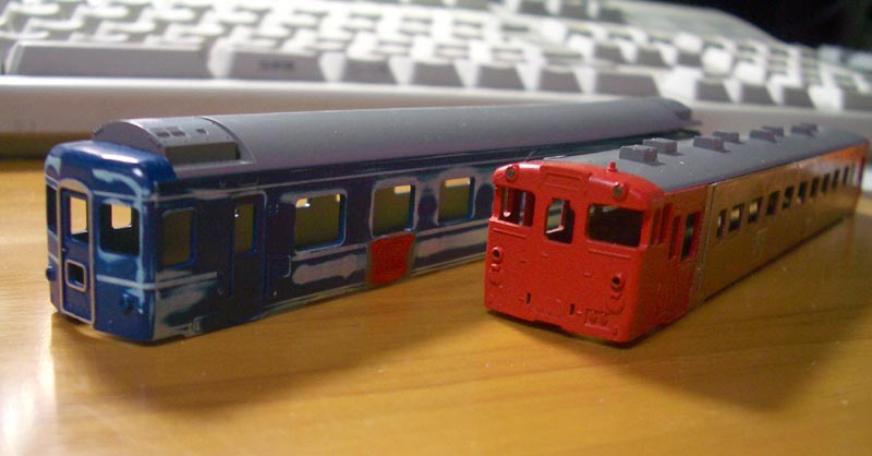 スハネフ14ですから。。。 マスキングは0.4mmくらいですよぉ、これで。 キハ54の方は白と黒が0.3ですぅ。 下回りの転用は自作ならではですぅ。 うちの54も下回りが用意できてなかったので、とりあえずその辺にあったキハ58から。。。 |