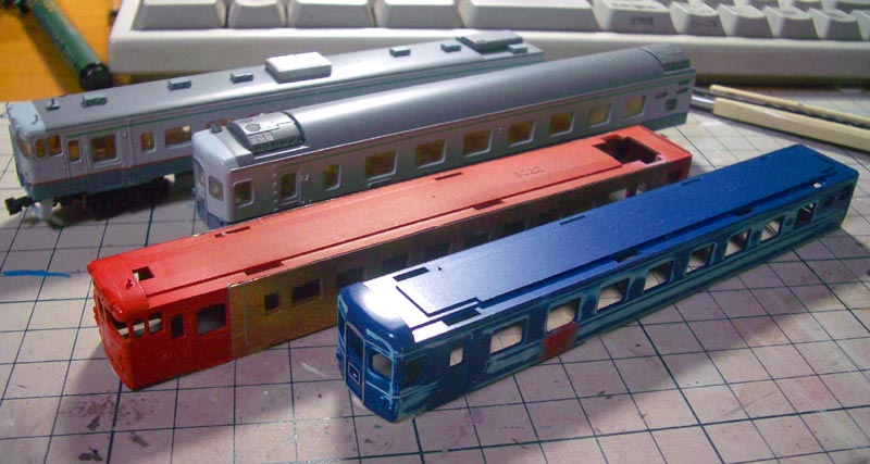別売りウレタンでケースの収容量数増やした結果が、この残骸なんですよねぇ。 今日も勢いで加工。 北斗星用オハネフ25にキハ480で余った空気取り入れグリル移植して、スハネフ14風(愚)。 給水口の新設とか、排気管のためのクーラー移動とか、クーラー形式違うとか、 窓埋めやってないとか、ドア位置違うとか色々無視して、このまま塗っちゃって雰囲気だけでも。 手を加えてでこぼこにするより、そのままでも色塗ればきっといい感♪。 北海道車が一気に4両下地ができたけど、色塗るのは一体いつだろ(愚)。 DE10の並びいいですねぇ。 うちも3色できるかぁ。 最終的にはシルフィード作って4色の予定。。。 |