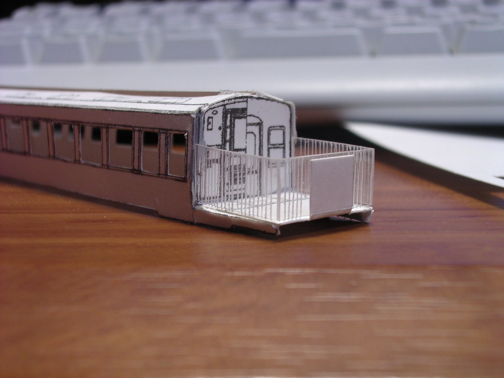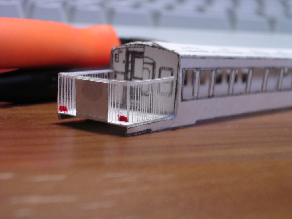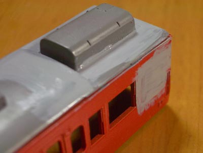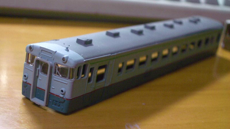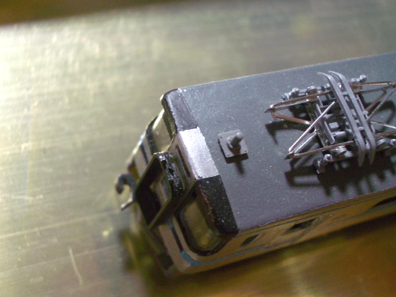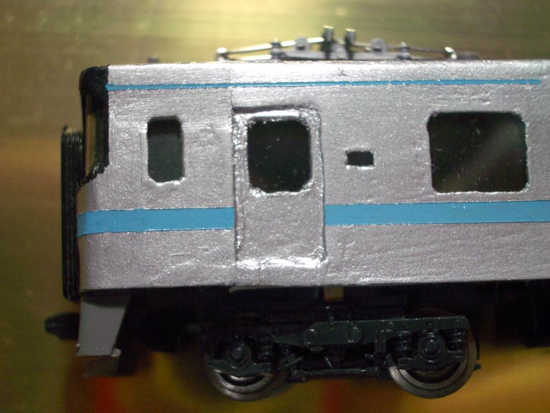 そういうやり方で前の丸さはペーパー曲げただけで表現。 乗務員扉の筋彫りは塗装で埋まっちゃってるし(愚)。 |