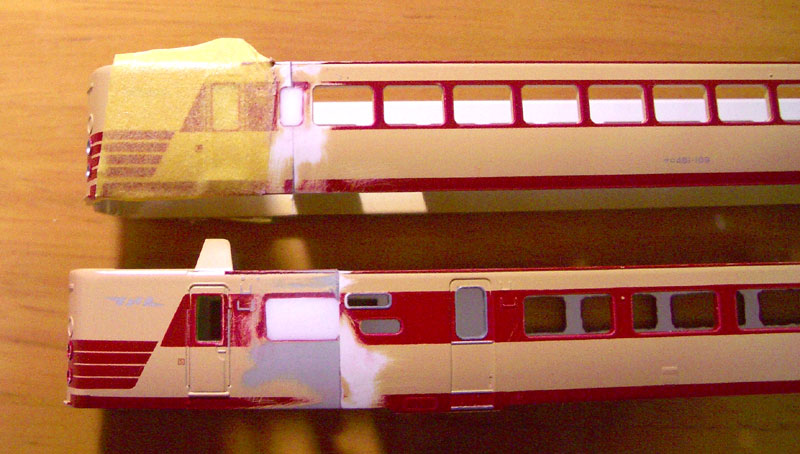 1両マスキングしたらすぐ塗装。結局いつもどおり1両づつの塗装となってしまうんですよね。