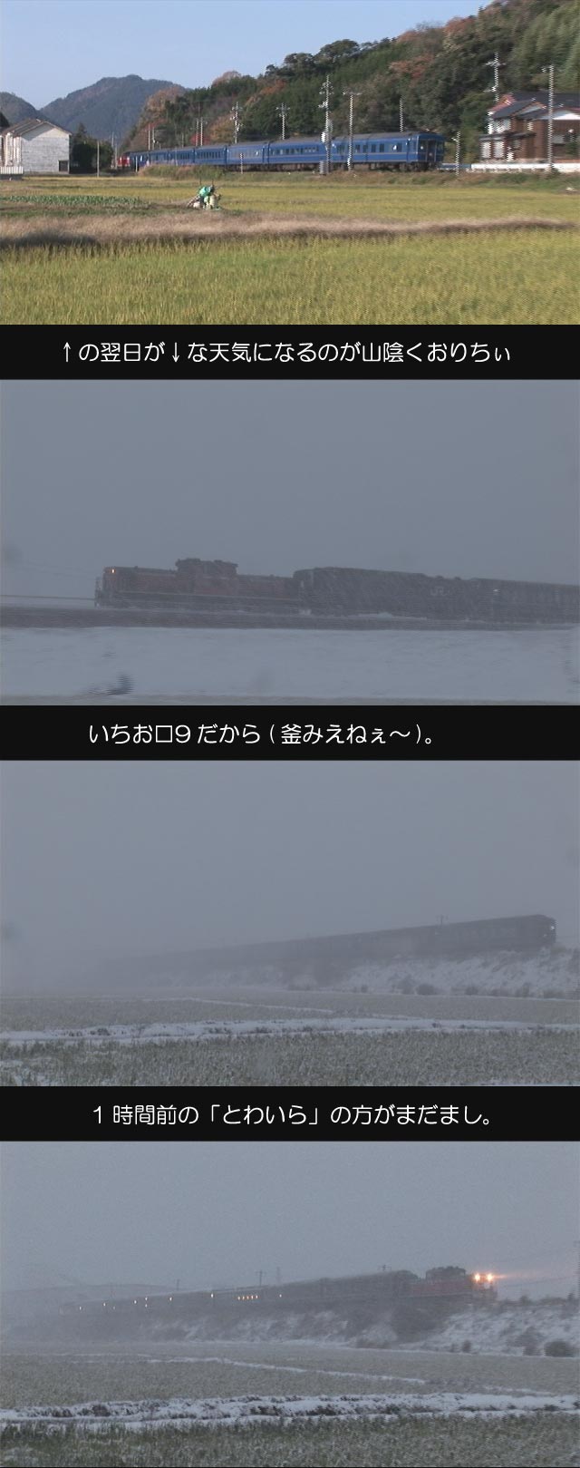 いまひとつ収穫無し...。 今日は、スリップ事故のトラウマと共に餘部にお出かけ...。 ...のはずが、鉄橋の神様の結界を破れず浜坂折り返し...orz 所により視程10m以下の道をへろへろと走ってたら、とわいら撮影準備間に合わず(泣) |