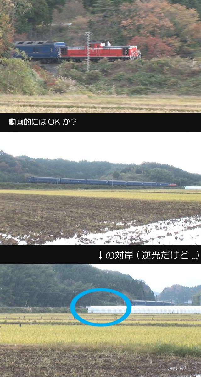 HD生かすとしたら、0.30でカマ+2位の画角になるくらい粘って、そのままアップでパン。 0.45でカマが横に来たところから、引きはじめてわずかにパンしながら編成全体おさめておしまい。 なんてのはいかが? 雪粒がアップにしたとき生きてくるから、HDなら。 でも走って良かったねー、今日も抑止したって言うし餘部 |