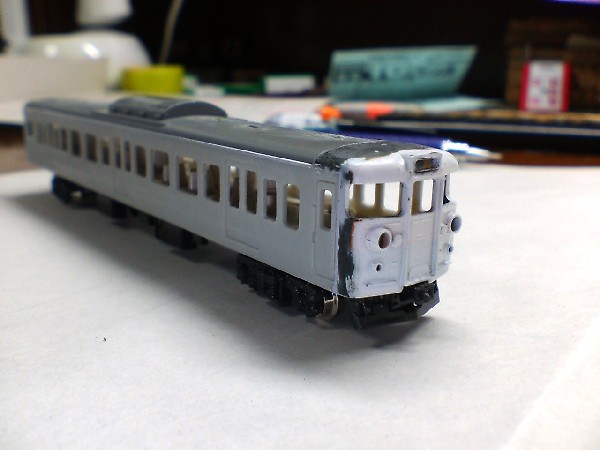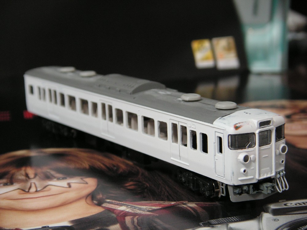 結構黒に近いグレーです。自分は国鉄型の屋根用として使っていますが。 製作中の113系はやっとサフ吹きまで。 ここから暫くは放置です、先客の485系があるので(笑 ちなみにベンチレーター撤去姿じゃありませんので… |