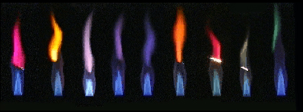 化学の授業じゃ炎色反応の単元じゃ Li(赤)Na(黄)K(紫)Cu(緑)Ca(橙)Sr(紅)Ba(緑) と教えるけど...。銅イオンは青に近いみたい。 |