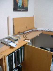 某本に載ってたのによると、 「車庫をたくさん作るのは、かえって操作が大変となる。私の場合には、鷲づかみで車両を入れ替えている…」 車庫は、4〜6本あれば大丈夫!! といいながらも、余剰ボードを使って大型の運転所を作る計画をしてるとか… くわばら〜くわばら〜 さてと、昼からは僕もホームを作ろうかなあと… 7両分ぐらいです。 |