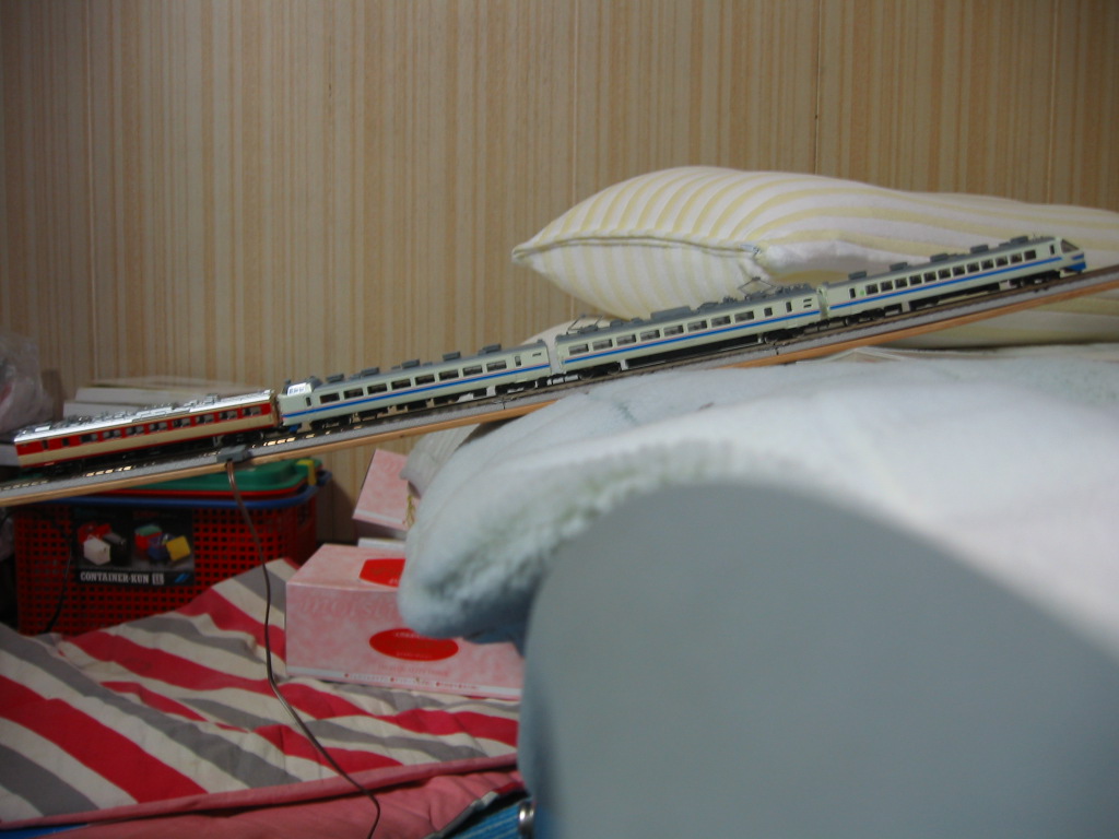 碓氷以上の急勾配です(苦笑) ごらんの通り、スーパー雷鳥3両動力つき+485国鉄カラー1両で走っています。 これでも、走っていない状態に等しいですが、モーター音がなっています。ちゃんと動いてるってことです。 一応、スピードをかなりあげれば、上ってくれてたんですけど。。。 とめると、滑り出します(笑) ちなみに、線路のしたに敷いてあるものが、150cmのものさしです(笑)。 しかも、太さは線路より一回り大きいぐらい…詳しくは明日!! |