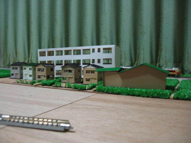 メーカーからは、そういうなの出てないっぽいのでペーパーで自作。 でも結局は、うちの学校の新校舎をモデルに。南校舎の方は、築30〜40年ぐらいっぽい。 木造2階建てのうす緑色じゃあちょっと… レイアウト自体が、現代風景だから… |