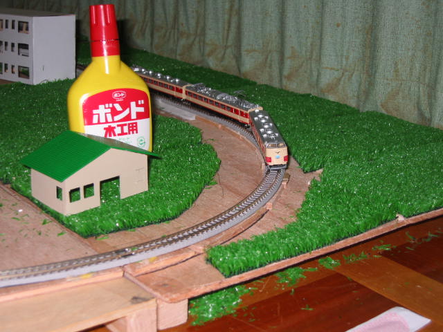ってのはどう? 時間かかりすぎ。。。 楽に行くなら、ラッカー系塗料だけど、なんかくっつきそう。。。 バラストは昔、海の砂と砂場の砂をふるいでふるって作りましたぁ。 固着したあと塗装。 |