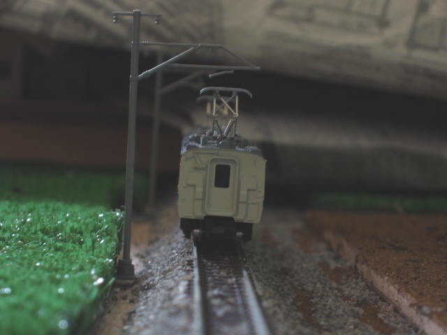 あの架線柱・・・・・ バラストまくときになおしますぅ。 前から気になってたんだよね〜〜ちょっと傾きすぎ・・ |