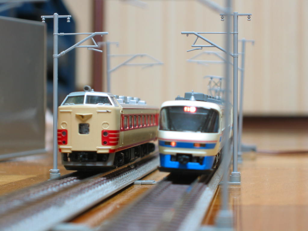 クハ481の代わりに、サシ481でも。。。 中間回送運転台で、そのまま運転♪ >こうたさん HOナローやってる人が、時々NとHOの線路で3線軌道はやってますねぇ。 まぁ、16.5と9なら4線でも大丈夫ですねぇ。 13と9だと3線が精一杯? >神崎川さん ミニミニサイズで作ってみるのがお手軽おすすめですぅ。 |