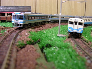 キハ32がいい感じのローカル線♪ 四国物対決で7000系電車のローカル線らしい。 うちのバラストはこんな感じですねぇ。 ちなみにこれは、TOMIXレールにKATOバラスト。 >こうたさん 洗剤は台所用中性洗剤ですぅ。 界面活性剤を放り込めれば何でもいいんだけど。 建物に角材系入れるのは丈夫になっていいですよねぇ。 うちの場合、ペーパー自作車両にも角材入ってるっぽいですぅ。 あと、接着中の仮固定用に、そこら中のおもしになりそうなもの使うし(愚)。 |