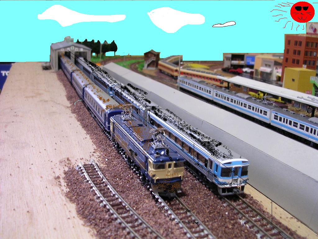 みなさん面白いことやってますねぇ〜。画像加工はあんまり考えていませんでした。 でもおもしろそうですね。今度やってみます。 えっと、ついにウチの部屋の悪夢が実体化しました。(愚) といっても土台が一通り完成して、一応の運転が出来るようになっただけですが… テスト走行の感想……目が回ります。助けてください(涙) あとで画像とかアップするかもしれません。あと、今回土台設置前の写真撮ってないので、記事(HPの)は内容が薄めです。(汗) 一先ずそんなところです。 コレでやっと相鉄に移る予定です。ただGWはやるかどうか… |