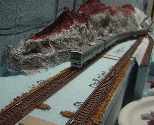 200円以上のお買い物で100ポイントもらえるし☆。 (4回に1回は1000円以上買わなきゃ駄目だけど。) とおもいつつ最近車両が揃いきって、買う物がすっかり減って。。。 本日の写真は、少しずつ進展する岩場付近。 だいぶ雰囲気が出てきましたねー。 展示台で作った部分との接合もなんとか。。。 |