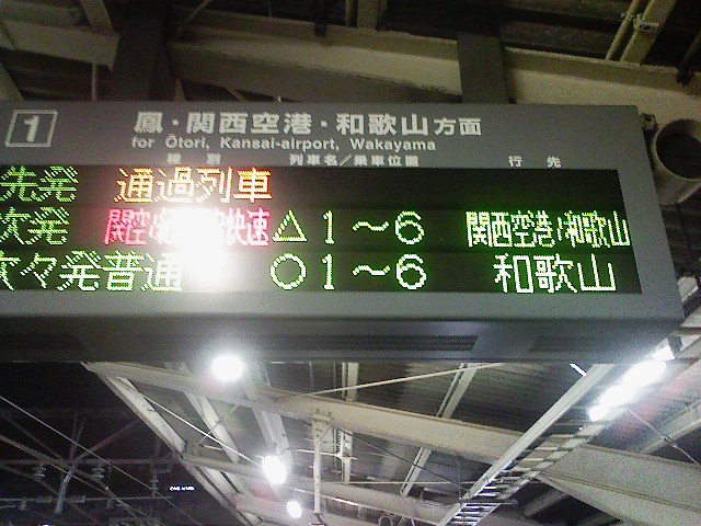 直通快速日根野行き4205M。 あ、この種別は次の改正からか(ぐ。 今は種別無し快速? 大阪駅に入ってくる関空無しはこれだけだったかなぁ、阪和直通で。 とりあえずここでも座れたので、帰り道全区間着席です☆ 前に座ってるカップル、微妙に鉄会話してるwww 223ー2500なんだけど、UVカットガラスだとか、椅子が堅いとか、座面が低いとか、南海がいいとか、京阪の普通車両はベンチ並に背もたれが低いとかwww 2500が大量に増えるとか教えてあげようかwww そして今回の旅はこの快速で終了。 鳳で降りておしまい。 お疲れさまでした☆ しかし、環状線かっ飛ばすなぁー、この快速。。。 13分で天王寺だから、全開じゃないと無理か。 3つとまるし。 |