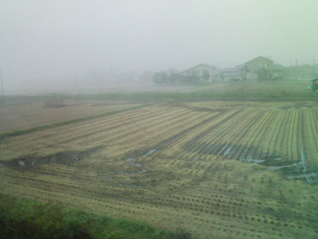 ものすごい真っ白な霧が晴れの空を覆って、かもしかも霧徐行。 大館場面5分延着 まだ霧が続いてるけど、どのくらい遅れるんだろう。 目の前で霧がわいてるのが見える。。。 田畑から。 |