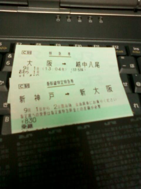 あと、脳みそから何かが垂れたのでw さて、鳥取→大阪→(新大阪→新神戸→新大阪)→大阪→越中八尾 乗車券は鳥取-(山陰-福知山-東海道-湖西-北陸-高山)-越中八尾、大阪(区)⇔新神戸 この行程の場合、大阪発着の在来線特急、乗り継ぎ割引適用になるんだっけか? まぁ、取れないんですけどね・・・。速度種別A32を如何なく発揮するやつが |