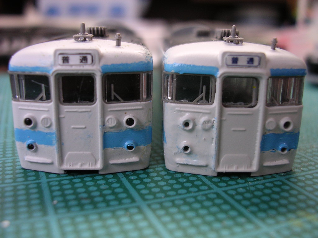 あの辺の形式に慣れ親しみがないせいか、差がわかんないですぅ(愚)。 117はオーシャン色がでるのがちょっと気になる今日この頃。 KATOの4両中古買ってきてオーシャン色に塗るかぁ。 |