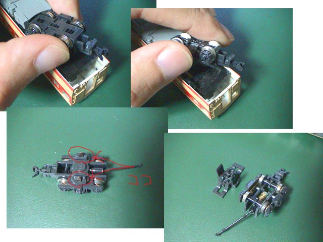 今作ってる東海タイプクロのくろしお色もなかったもの(愚)。 381系の有効活用ってことで、なんとなく。。。 103の増結もそろそろ始めるかなぁ。 >神崎川さん 質より量ですから……。 ってか、色剥がしはいっぺんにやらないとシンナーもったいないですし。 剥がしてるうちに揮発したりふき取ったりでほとんど無くなるけど。。。 動力の52ですか? まず台車ごとひねってはずして、台車の中にある突起を押しながら、ギヤ部分を下に落とし込みます。 そうしたら、車軸が見えるのであとは適当に。。。。 |