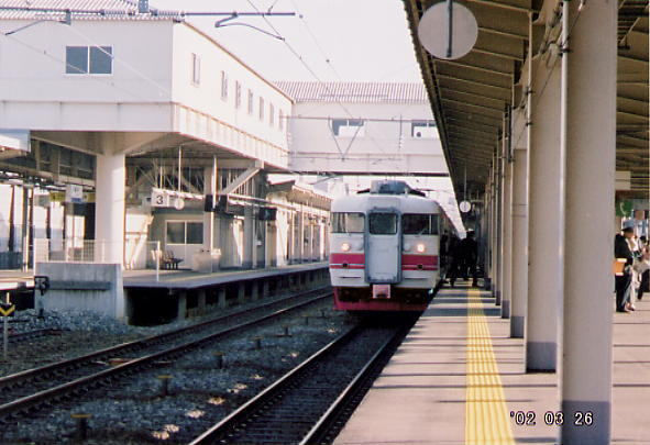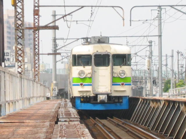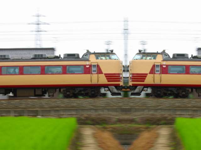 485しらさぎのヘッドマークがイメチェンし、赤っぽい色になった こっそり後ろに211⇒415が… |
