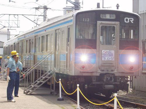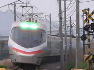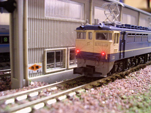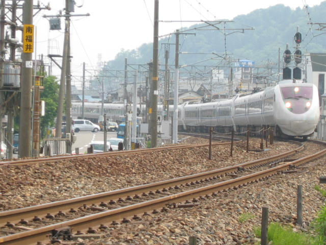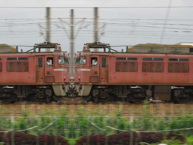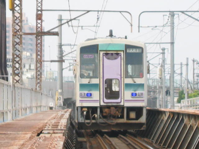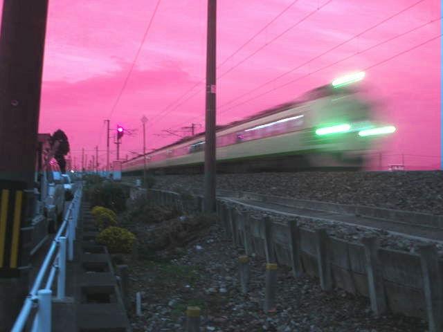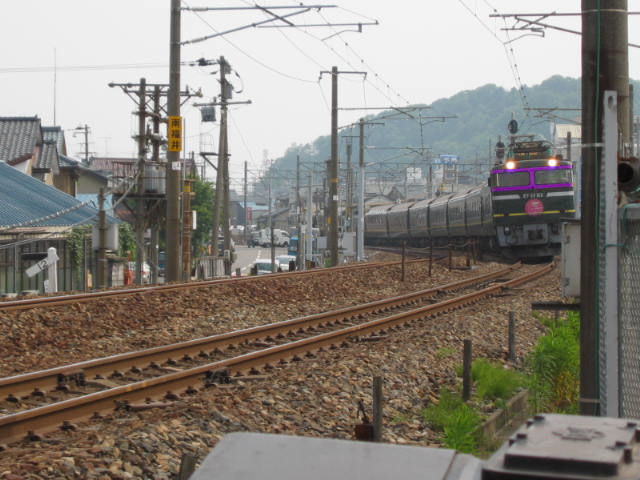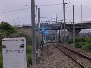 この写真は、危険箇所で撮っていません。 のろのろ走る回送列車が踏切を渡りきった後、いそいで踏切へ入り撮影したものです。 |