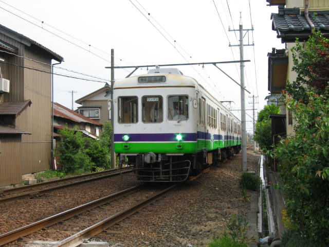んで次。 京福から受け継いだえち鉄は、 3001形を塗装するのが面倒くさいという理由で、京福の社紋プレートだけ自社の色にしちゃいました(愚) |